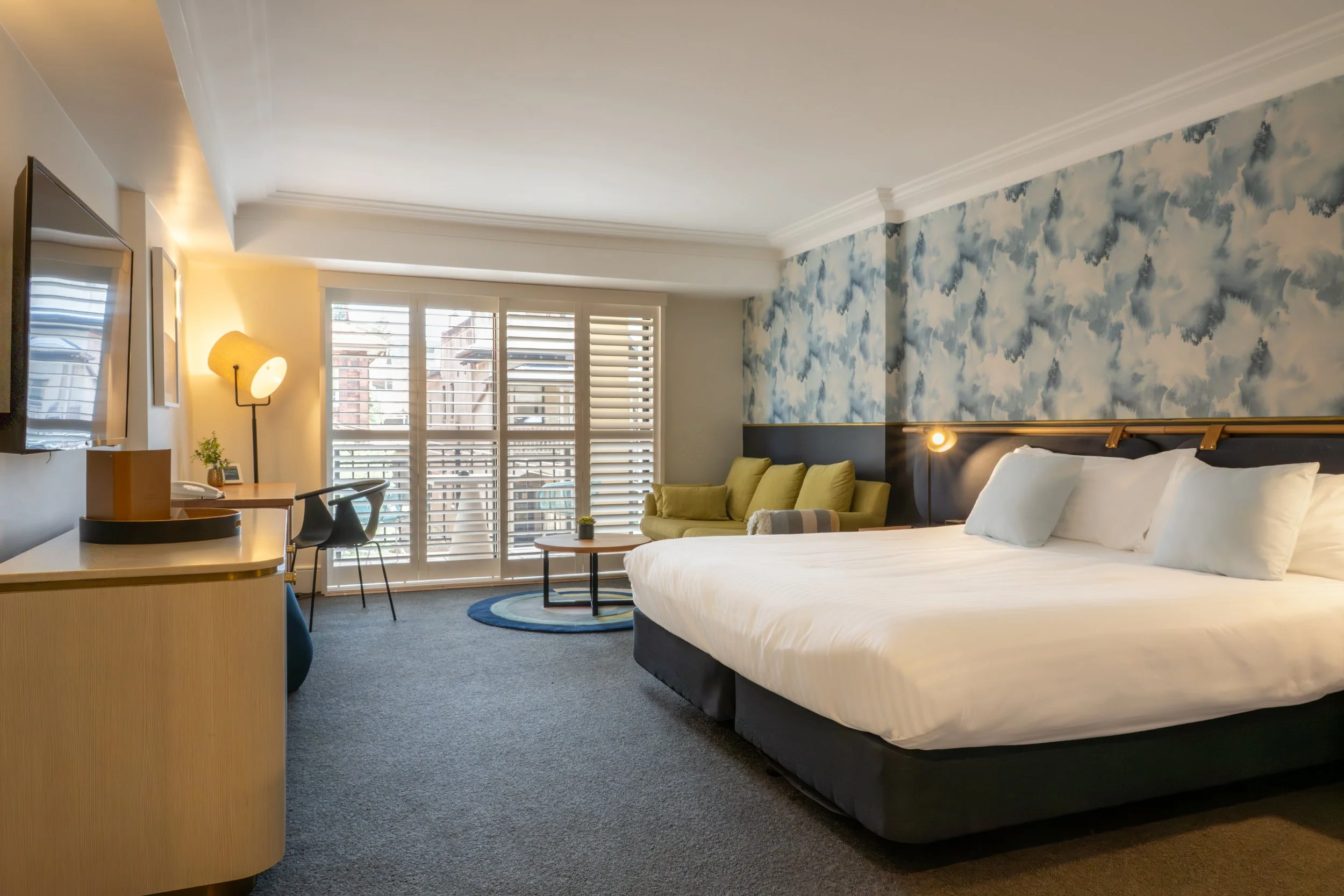 Our Boutique District View rooms with disability access are set with either one king bed or with two single beds. These rooms have accessible marble bathrooms, a lowered kitchenette with microwave and mini-bar fridge, a sitting area, work space, and free high speed Wi-Fi. Each room also has its own private balcony.